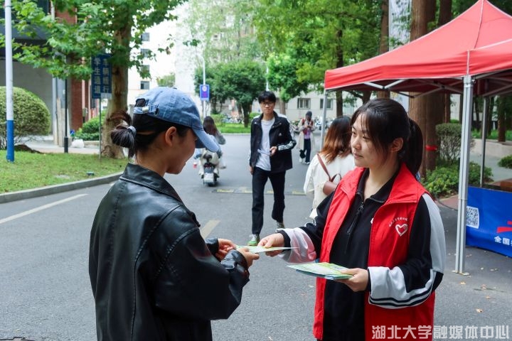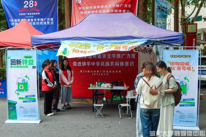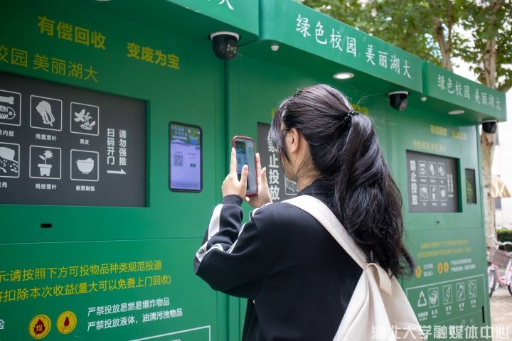 “同学来看一看!可以把自己的废旧物投放在这里,有偿回收哦!”9月20日,yl23455永利官网沙湖环保志愿队成员在嘉会园外摆摊,展示新学期新设施“智能环保回收柜”的用法用途,吸引众多师生了解并关注旧物回收。
