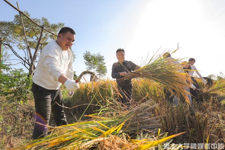 “这不仅是一次劳动体验,更是一次露天课堂,如何弯腰收割不伤手、如何捆扎稻谷不易散、水稻怎么割才利于下一次播种……这些都是平时学不到的宝贵经验。”2024级合成生物学专业本科生谭可馨笑着说,“我们这些大学生应该经常参与这种‘接地气’的实践活动,让自己的科研成果长在祖国大地上。”