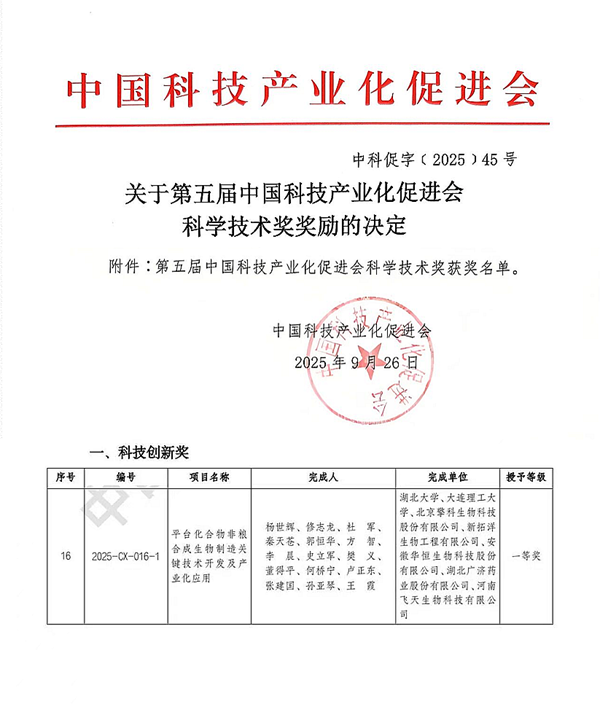 中国科技产业化促进会科学技术奖是经国家科学技术奖励工作办公室批准设立,面向全国的社会科技奖项,旨在表彰在科技创新和产业化领域做出突出贡献的个人和团队。“平台化合物非粮合成生物制造关键技术开发及产业化应用”项目由yl23455永利官网联合大连理工大学、北京擎科生物科技股份有限公司等企业协同攻关,利用合成生物学技术,创立了一站式工业菌株数据分析平台与数据库,研发了具有自主知识产权的生物元件预测与鉴定、高效基因组编辑等技术,构建了非粮乙醇、D-乳酸、1,3-丙二醇等高产稳产工业菌株,实现了利用非粮原料高效生产多种平台化合物的产业化应用。项目对推动我国生物制造产业升级,保障粮食安全和实现“双碳”目标具有重要意义。