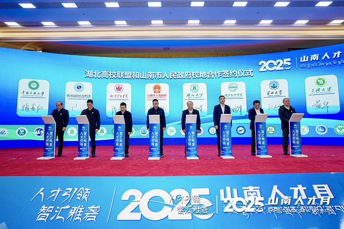 10月21日,谢红星出席2025年山南市人才月活动启动仪式,代表学校与山南市人民政府签订战略合作协议。校地双方将聚焦铸牢中华民族共同体意识主线,在教育、科技、人才、产业等领域开展全方位合作,协同构建校地企合作创新体系。学校相关单位负责人分别参加山南市教育强市建设、生态文明建设、文化旅游产业升级等6场校地合作座谈会,与山南市相关部门及企业对接合作需求。