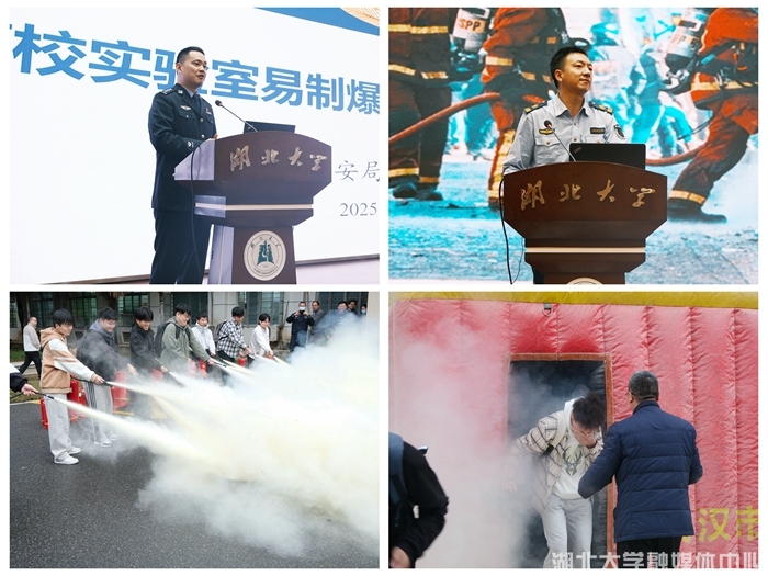 武汉市公安局治安大队宫保振作了“高校易制爆危险化学品治安管理”的专题报告,全面阐述公安机关对高校危化品的管理要求和主要做法。武汉市进安消防中心周文强教官以“全民消防、生命至上——安全用火用电”为题,普及丰富的消防安全知识和消防救护技能,并指导师生开展灭火和逃生演练。